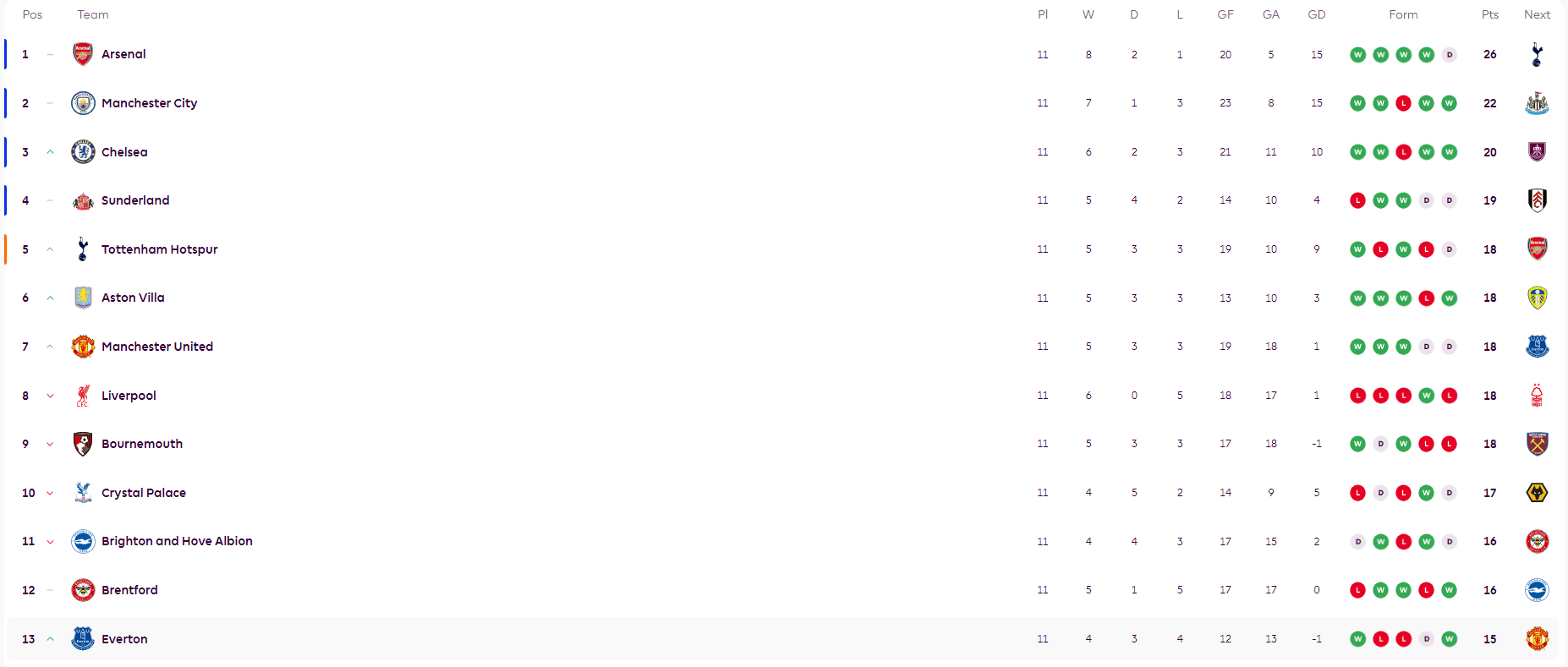 北京时间11月10日,2025-26赛季英超联赛战罢第11轮,积分榜情况如下: