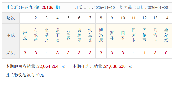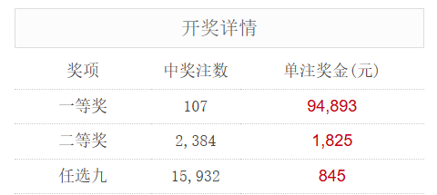 足彩25165期开奖结果:一等奖107注 单注奖金9.4万元