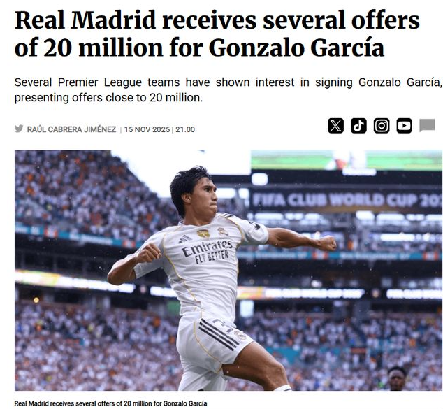 世俱杯成名的贡萨洛-加西亚很有天赋,但在皇马,贡萨洛-加西亚与姆巴佩、维尼修斯竞争,想要出头难度极大。桑德兰当地的《回声报》消息称,至少3家英超俱乐部有意引进贡萨洛-加西亚,“黑猫”是其中之一。