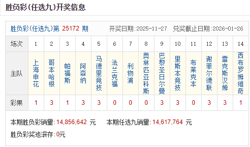 足彩25172期开奖结果:一等奖11注 单注奖金60.5万元