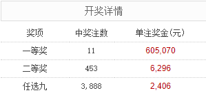 北京时间11月27日,足彩25172期开奖。本期全国中出一等奖11注,每注奖金605,070元,二等奖中出453注,每注奖金6,296元。另外,任选9场中出3888注,每注奖金2,406元。