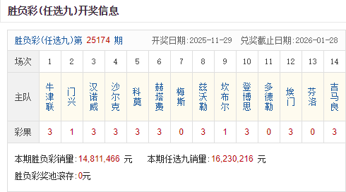 足彩25174期开奖结果:一等奖6注 单注奖金110万元
