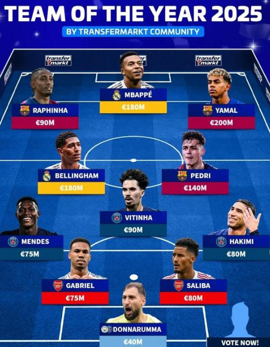 时间:2025-12-06 15:37:26北京时间12月6日,德转通过用户投票评出2025年的最佳阵容,姆巴佩和亚马尔领衔,巴塞罗那和巴黎圣日耳曼各有3名球员入选,皇家马德里和阿森纳2人入围。