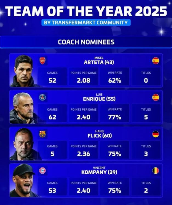 时间:2025-12-06 16:14:00北京时间12月6日,德转列出了年度最佳主帅的四位候选者,阿森纳的阿尔特塔、巴黎圣日耳曼的恩里克、巴塞罗那的弗里克以及拜仁慕尼黑的孔帕尼入围。