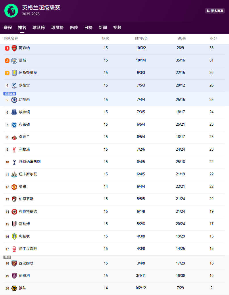 积分榜方面,阿森纳近段时间无力赢硬仗,被曼城不断缩小差距,本轮过后阿森纳就只剩下2分优势了。近段表现更差的切尔西排名更是一跌再跌,从第2跌到第4,今天水晶宫绝杀赢球后,更是将切尔西挤出前4。利物浦被布莱顿超过后,又回到第9的位置。
