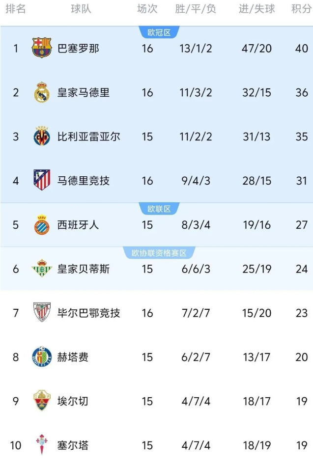 随着这两场比赛的结束,西甲积分榜也发生了变化。巴塞罗那在之前的比赛中获胜,以37分领跑积分榜。皇马本轮爆冷输球,积分停留在33分,不仅被巴萨将领先优势扩大到4分,而且仅领先身后少赛一场的比利亚雷亚尔1分,第二名的位置岌岌可危。西班牙人则凭借这场宝贵的胜利,积分达到27分,超越皇家贝蒂斯,升至积分榜第五位,稳居欧战区。巴列卡诺以17分位列中游。皇马主场全胜纪录被终结,这也是近年来他们首次在主场输给塞尔塔。本场比赛的三张红牌(球员两张,教练一张)以及皇马在比赛中的被动表现,都让这场失利更显意外。西班牙人则继续保持低调稳健的态势,在争夺欧战资格的道路上稳步前进。本轮比赛的结果,让西甲联赛的竞争格局变得更加开放和激烈。