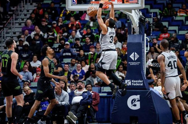 马刺上一场客场117-130输给骑士,鹈鹕过去6场遭遇6连败位列联盟垫底,本赛季前两次交锋马刺均取胜。本场马刺缺少文班亚马、麦克劳林,鹈鹕缺少锡安、穆雷、普尔。首节开局双方缠斗至9-9,马刺连得4分,鹈鹕连得5分反超,马刺内外开花逐步扩大26-20领先优势。阿尔瓦拉多三分命中,马刺一波9-2攻势拉开比分,首节结束马刺35-25领先鹈鹕。马刺25中13超过5成准星,其中三分8中5超过6成准星,鹈鹕23中10,其中三分8中2低迷。