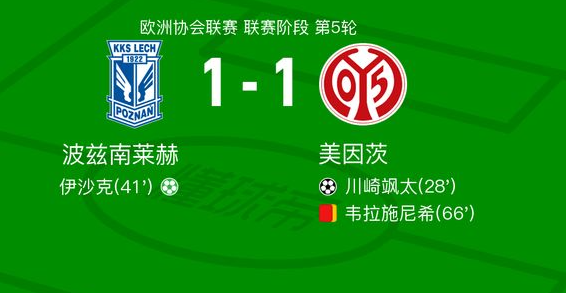 北京时间12月12日,欧洲足联欧洲协会联赛联赛阶段第5轮展开较量,波兹南莱赫与美因茨狭路相逢。比赛中,川崎飒太接霍勒巴赫助攻率先破门,为球队取得领先。随后伊沙克主罚点球命中,将比分扳平。比赛进行至后段,韦拉施尼希领到第二张黄牌被罚离场。最终双方以1比1握手言和。