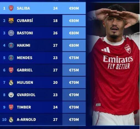 时间:2025-12-14 16:04:21德国转会市场公布了后卫球员身价世界排名,萨利巴以9000万欧居首,库巴西、巴斯托尼、阿什拉夫均8000万欧。