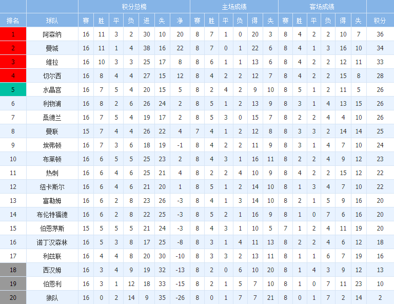 英超积分 曼城维拉赢球紧追阿森纳 利物浦切尔西曼联争4
