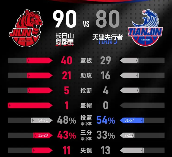 第四节,长白山恩都里在开局时打出一波迅猛进攻,瞬间建立起13分的优势。虽然随着比赛的深入,天津先行者在小节后段奋力追分,但长白山恩都里始终保持领先,并在比赛的最后时刻稳住局面。最终,长白山恩都里以90-80战胜天津先行者,赢得了比赛。