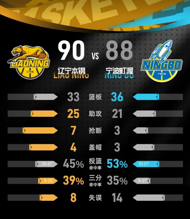 第四节,辽宁本钢继续保持良好的状态,开局便通过一波攻击将优势扩大至15分。但随后宁波町渥展开反击,将差距缩小至2分。尽管如此,在小节后段,辽宁本钢稳住了进攻节奏,最终将比分再次拉开,锁定胜局,以90-88赢下比赛。