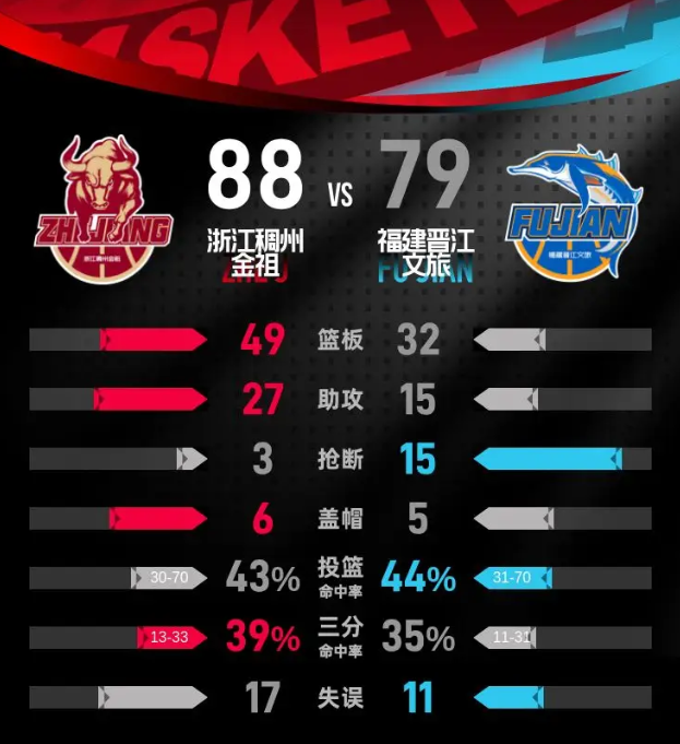最后一节开始时,浙江稠州金租的表现显得有些低迷,分差一度被扩大至7分之多。但随着比赛的推进,浙江队逐渐找回感觉,开始加速反击,成功将比分追平并反超12分。比赛最后阶段,福建晋江文旅奋起直追,试图缩小分差,但浙江稠州金租最终稳住了局面,以88-79赢得了比赛。