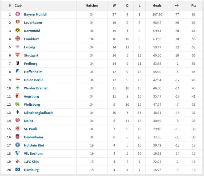 第二名是勒沃库森,全年取得19胜9平6负的战绩,第三名是多特,19胜7平8负。