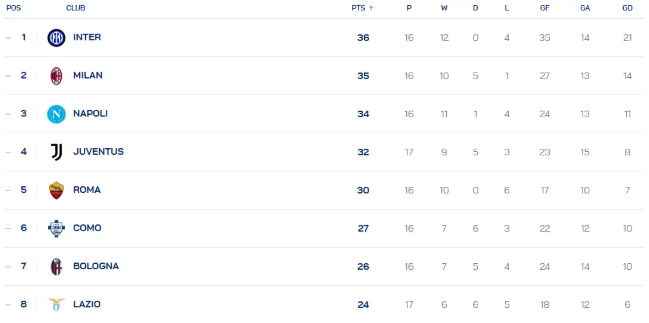 时间:2025-12-29 11:57:00北京时间12月29日,意甲第17轮基本战罢,仅剩罗马VS热那亚一场,积分榜情况如下: