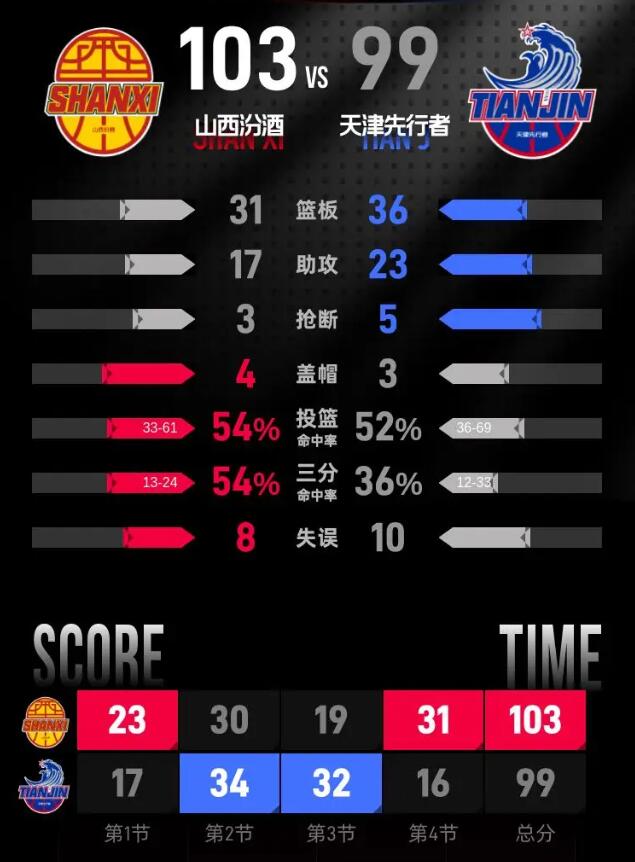 第四节,山西汾酒在开始阶段表现不佳,比分一度落后12分。随着比赛的深入,他们逐渐找回状态,开始发力,成功将比分追平并反超4分。在比赛后段,天津先行者也进行了调整,试图缩小分差。本节中,山西汾酒的马尔科·奈特表现抢眼,得分达到17分,其中包括两记三分。最终,山西汾酒以103-99战胜了天津先行者,收获比赛胜利。