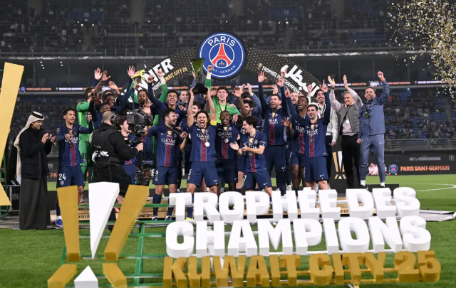 北京时间1月9日02时,法国超级杯决赛在科威特贾贝尔-阿尔-阿赫迈德国际球场展开角逐,巴黎圣日耳曼在常规赛中与马赛2-2战平,随后在点球大战中4-1胜出,最终以6-3的总比分夺得冠军。登贝莱第13分钟先拔头筹,格林伍德和帕乔的乌龙球,一度让巴黎圣日耳曼1-2落后,替补出场的拉莫斯补时第5分钟打进绝平球,将比赛拖入点球大战。在点球大战环节,巴黎圣日耳曼门神舍瓦利耶连续扑出奥赖利和特拉奥雷的点球。巴黎圣日耳曼实现法国超级杯四连冠,也是该队第14次夺得该项赛事冠军。