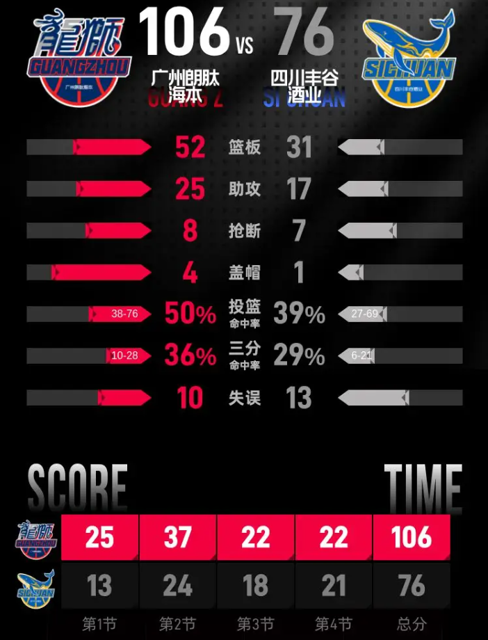 广州带着29分领先优势进入第四节比赛,由于双方之间的比分差距太大,且两队实力相差悬殊,末节比赛已经提前失去胜负悬念。比赛早早就进入垃圾时间,双方也是逐步派上轮换球员,最终广州轻松大胜送四川开局13连败。