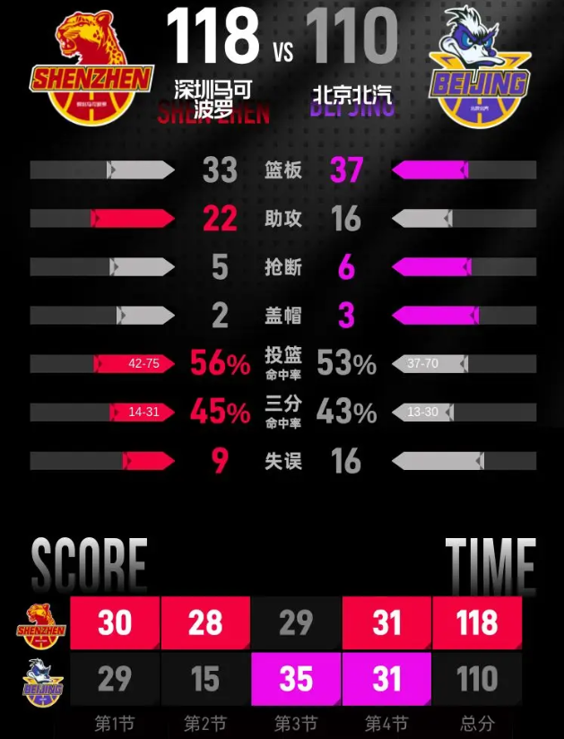 第四节,比赛进入白热化阶段,深圳马可波罗与北京北汽的攻防战愈发胶着。本节中,特奎维恩·史密斯继续表现抢眼,为深圳马可波罗再添11分,包含1记三分,而北京北汽的尤金·杰曼在本节同样为球队贡献了13分,包括1记三分。经过四节的激烈较量,深圳马可波罗最终以118-110赢下比赛。