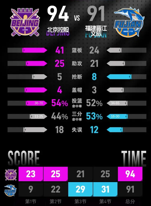 第四节,比赛进入白热化阶段,双方你来我往,局势胶着。北京控股的朱松玮表现出色,取得11分,而福建晋江文旅的以赛亚·布里斯科也有14分进账。经过激烈的较量,北京控股最终以94-91赢得比赛。