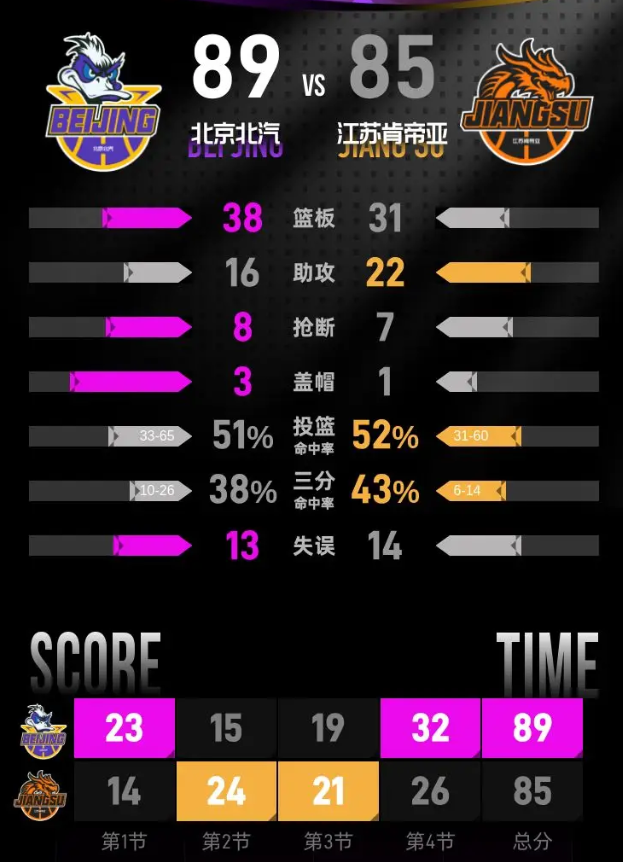 第四节,比赛形势对北京北汽并不乐观,球队开局表现不佳,分差一度被拉大至7分。但随着比赛的推进,北京北汽逐渐找回状态,强势反击,成功追平并反超比分,领先达到7分。尽管江苏肯帝亚在小节后段进行了调整,试图缩小分差,但最终未能逆转。第四节以北京北汽89-85赢得比赛而告终。