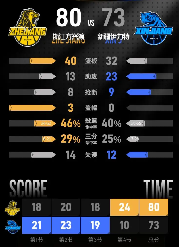 进入最后一节,新疆伊力特开局打出一波攻击,以68-59暂时领先。此后,浙江方兴渡开始发力,通过凶猛的攻势不仅抹平了分差,更是实现领先,最多领先新疆伊力特7分。在比赛的最后阶段,新疆伊力特奋起直追,逐步缩小分差。本节比赛,浙江方兴渡的胡金秋表现抢眼,单节贡献10分。最终,第四节结束时,浙江方兴渡以80-73赢得了比赛。