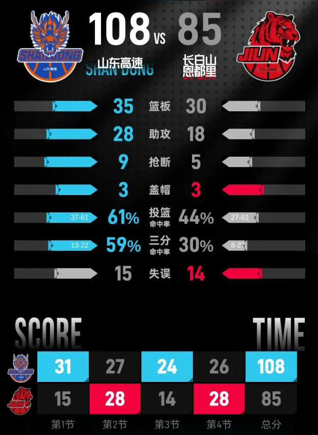 第四节开局阶段,山东高速手感有所下滑,双方的分差一度缩小至21分。随着比赛进行,山东高速逐渐找到状态,再度展开猛烈攻势,将领先优势扩大至30分。尽管在小节后段,长白山恩都里仍在努力追赶,但山东高速凭借早先建立的优势,最终以108-85赢得比赛。