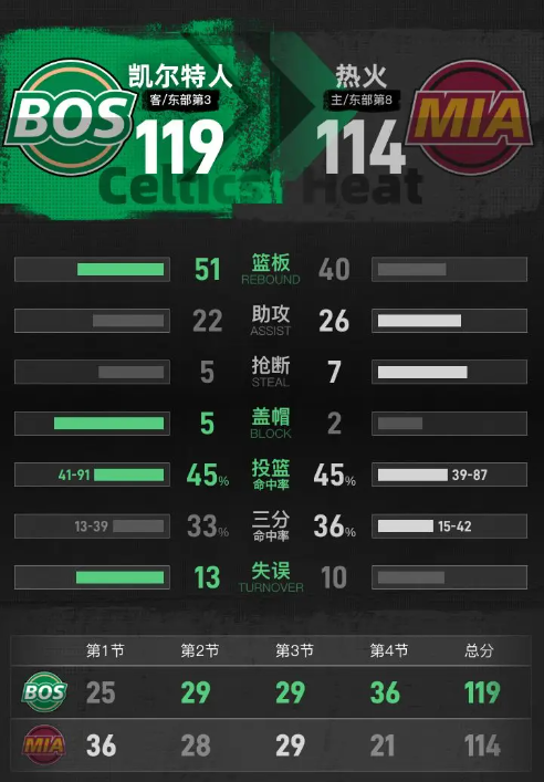 比赛进入最后一节,热火开局表现不佳,凯尔特人的手感火热,不仅抹平了比分,甚至一度领先热火6分。在小节后段,热火努力缩小分差,试图扭转局面。本节中,凯尔特人的西蒙斯状态火热,贡献了18分,其中包括2记三分球。最终,凯尔特人以119-114赢下比赛。