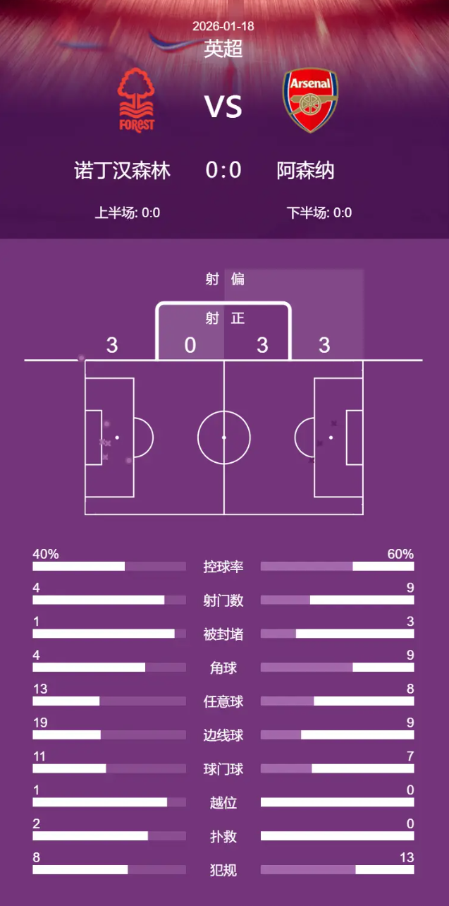 北京时间1月18日凌晨1:30,英超联赛第22轮,阿森纳前往客场对阵诺丁汉森林。上半场比赛,阿森纳占据优势未能转化为进球,半场两队0-0战平;下半场,森林门将多次扑救力保城门不失,最终阿森纳0-0战平诺丁汉森林,遭遇联赛两连平。但由于曼城本轮不敌曼联,阿森纳的领先优势暂时扩大到7分。
