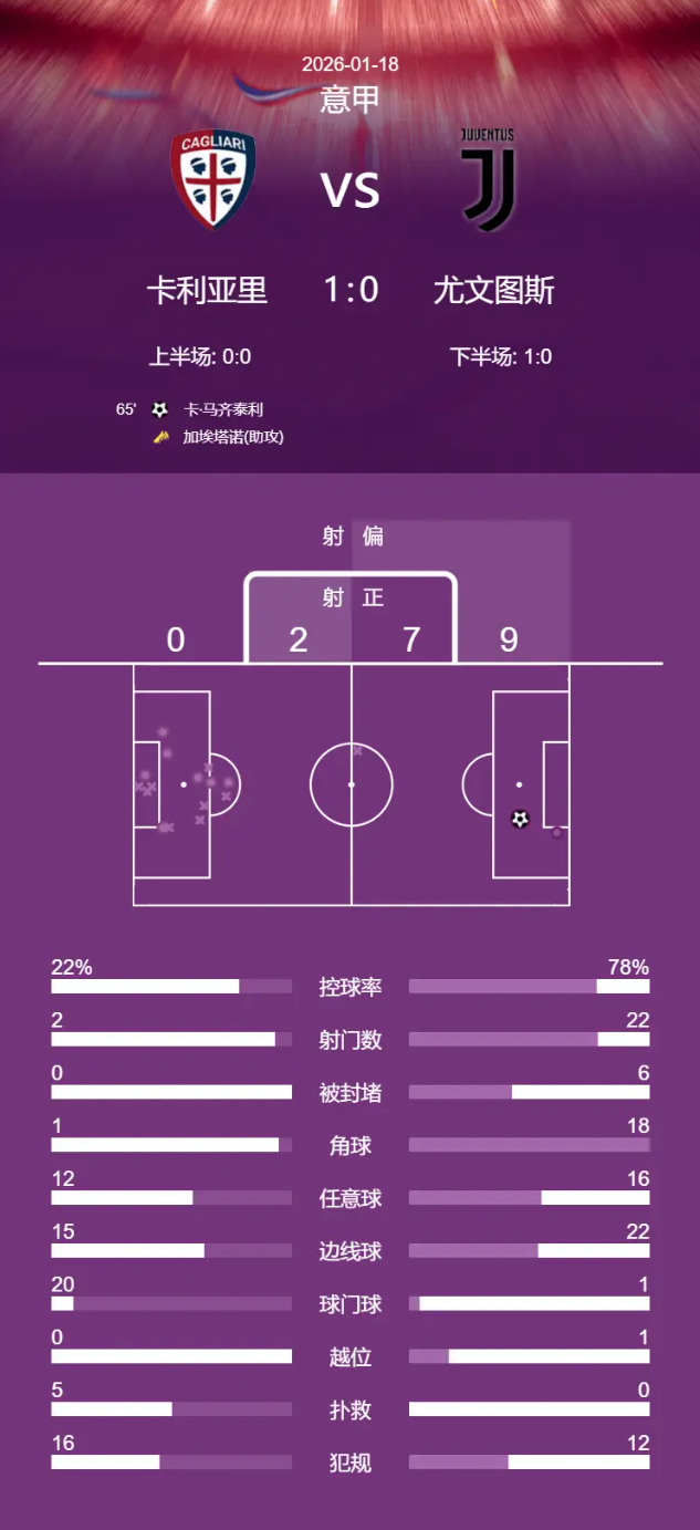 北京时间2026年1月18日凌晨3:45,意甲第21轮,卡利亚里主场迎战尤文图斯。上半场双方互有攻守但均未能打破僵局。下半场,卡利亚里凭借卡·马齐泰利的进球锁定胜局。最终,卡利亚里1-0小胜尤文图斯。