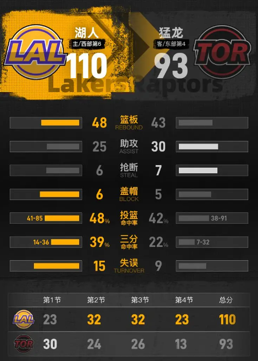 第四节,湖人队在开局表现强势,展开了一波19分的进攻潮,迅速拉开了与猛龙队的差距。随着比赛进入小节后段,猛龙队努力追赶,但湖人队的领先优势依然稳固。最终,湖人队以110-93赢下比赛。