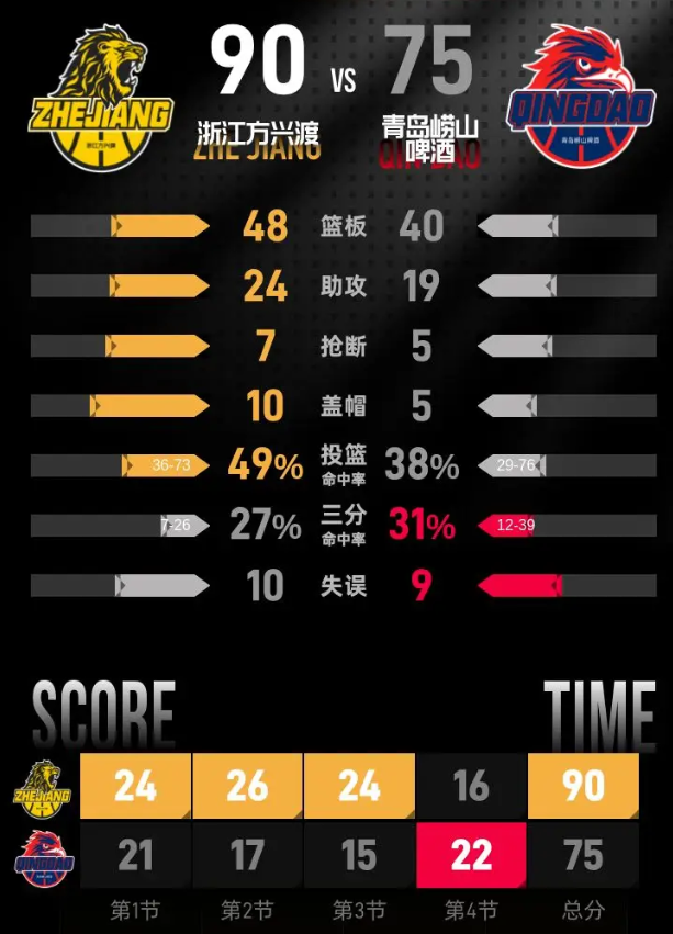 进入第四节,浙江方兴渡状态依旧良好,快速开局再次将优势扩大至24分。中段,青岛崂山啤酒展开反击,努力将劣势缩小至13分。然而,在比赛后段,浙江方兴渡保持稳定的进攻节奏,逐渐拉开比分,最终以90-75赢得比赛胜利。