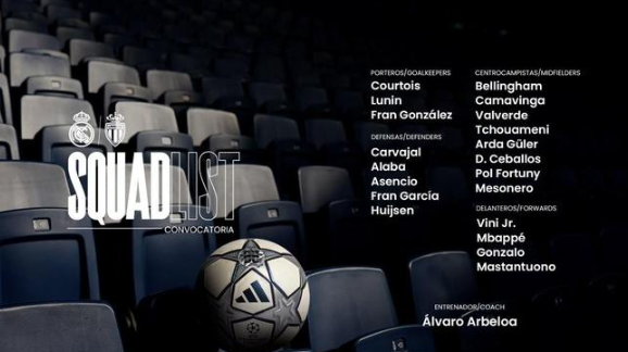 皇家马德里官方公布了欧冠联赛阶段第7轮主场对阵摩纳哥的比赛大名单,姆巴佩领衔,卢宁回归,卡雷拉斯因累计三黄停赛缺席。