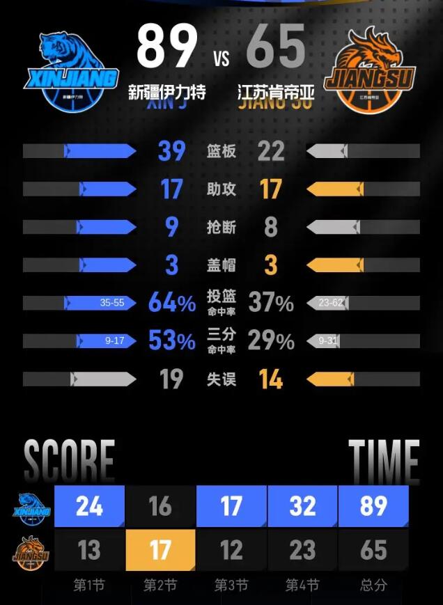 第四节,江苏肯帝亚奋起直追,努力将分差缩小至48-61,展现出强烈的求胜欲望。但新疆伊力特随即展开反击,再次将分差扩大至25分。尽管小节后段江苏肯帝亚再次努力缩小分差,但新疆伊力特稳住了局面。本节中,江苏肯帝亚的蒋浩然贡献了10分,其中包括2记三分球;新疆伊力特的凯文·哈里斯则狂砍18分,命中4记三分。最终,比赛以新疆伊力特的89-65胜利结束。