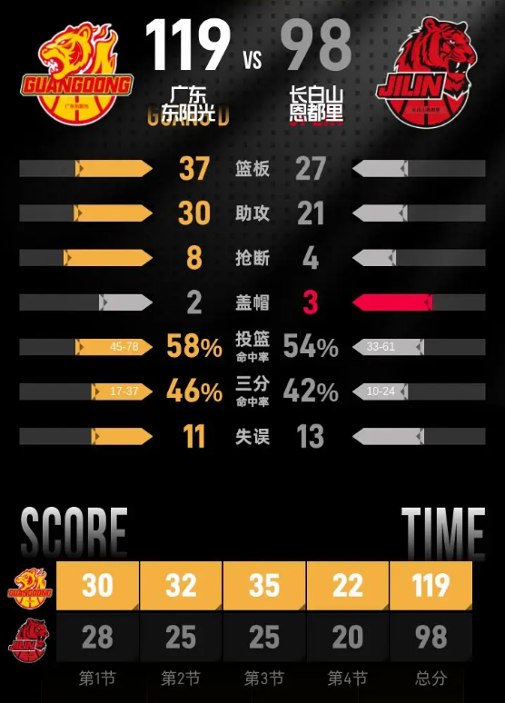 在最后一节,广东东阳光牢牢掌控比赛节奏,分差始终保持在安全范围之内,长白山恩都里未能找到有效的反扑机会。尽管双方在攻防上持续较量,最终广东东阳光以119-98赢得了整场比赛的胜利。