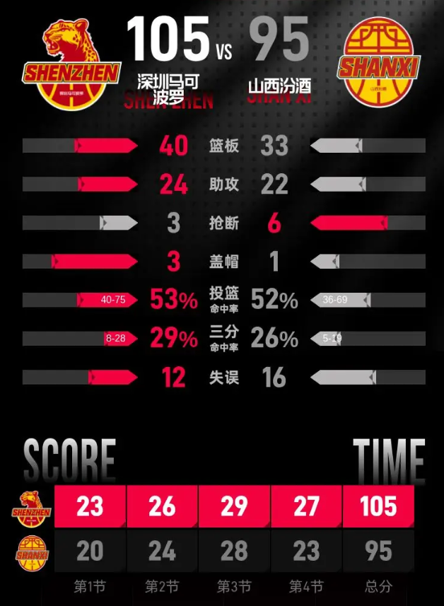第四节,深圳马可波罗开局迅速进入状态,一口气打出了17分的优势。尽管山西汾酒在小节后段奋力追分,但深圳马可波罗的领先优势依然明显,直到比赛结束。最终,深圳马可波罗以105-95赢得比赛胜利。