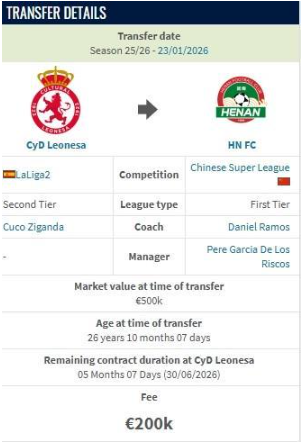 时间:2026-01-24 15:31:40德转显示,西乙莱昂文体边锋姆布拉加盟河南队的转会费为20万欧。