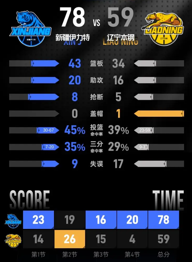 最后一节,新疆伊力特开局迅速进入状态,打出一波强势进攻,将领先优势扩大至19分。随着比赛推进,辽宁本钢努力追赶,逐步缩小差距。在比赛的最后时刻,新疆伊力特依然保持领先,最终以78-59战胜辽宁本钢,赢得比赛胜利。