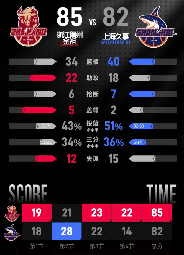 进入第四节,浙江稠州金租的表现依然不尽如人意,开局落后7分。随着比赛的深入,浙江稠州金租逐渐找到了比赛节奏,强势发力,不仅追平比分还一度反超5分。比赛后段,上海久事及时调整,试图缩小分差。最终,浙江稠州金租以85-82赢得比赛。