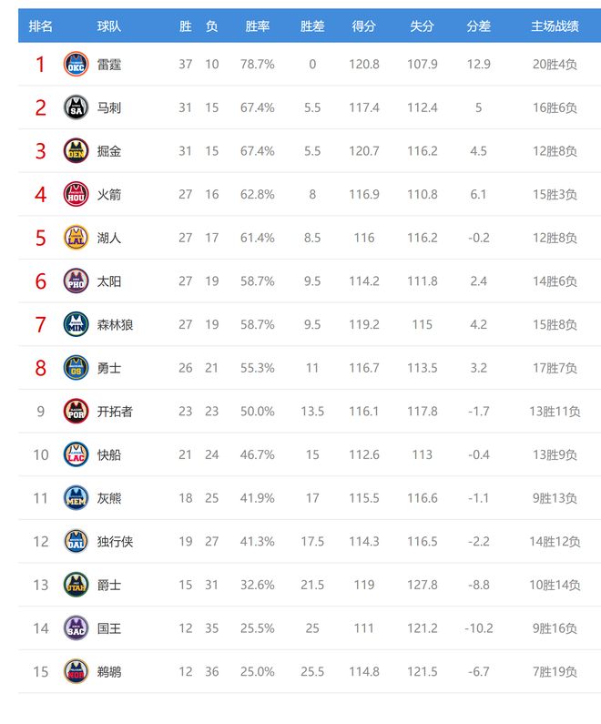 今日比赛后西部排名没有变化,但各队间的差距有所改变。