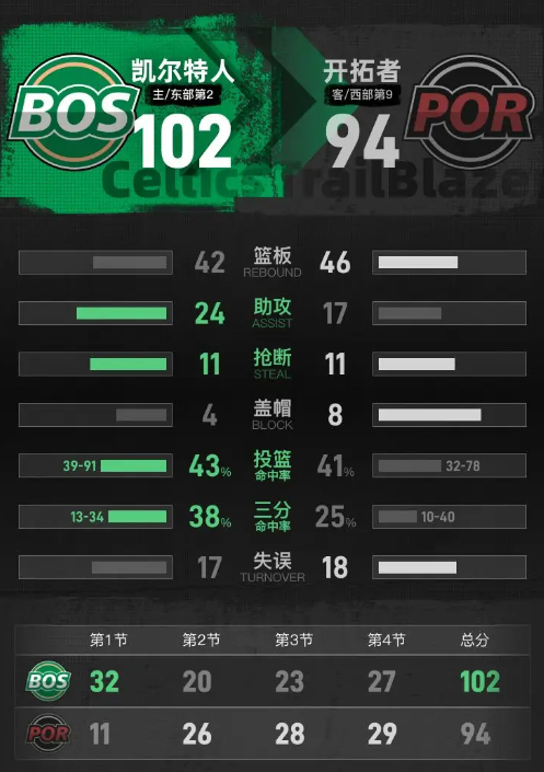 第四节,凯尔特人延续了良好的状态,开局迅速将优势扩大至16分。尽管开拓者努力反击,将差距缩小至5分,但凯尔特人及时作出调整,稳步拉开比分。怀特在本节中表现出色,贡献了10分,包括两记三分,最终以102-94赢得比赛。