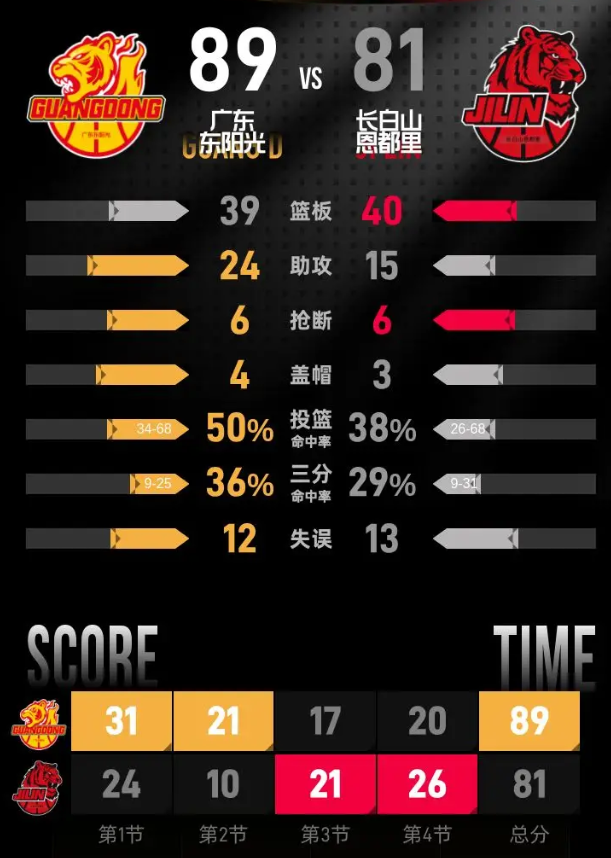 第四节,广东东阳光状态依旧火热,开局再次通过流畅的进攻将优势扩大至18分。此时长白山恩都里奋力追赶,成功将分差缩小至7分。但广东东阳光在后段保持稳定的进攻节奏,进一步扩大了领先优势,最终以89-81赢得比赛的胜利。