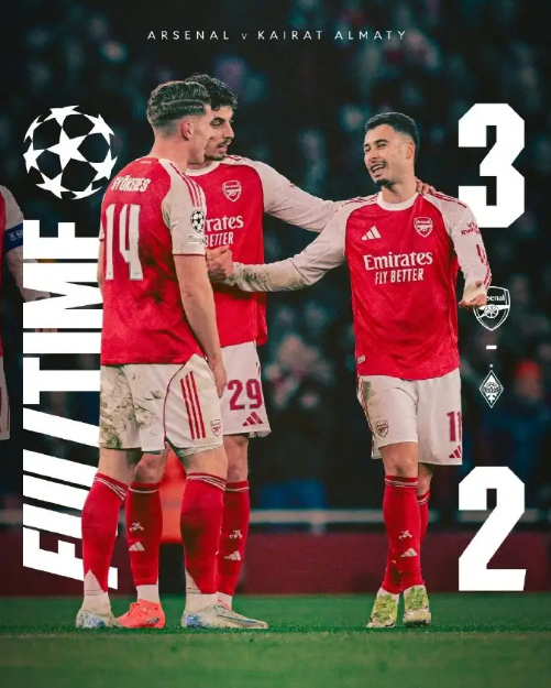 最终,阿森纳3-2战胜阿拉木图凯拉特,欧冠八战全胜直通16强。