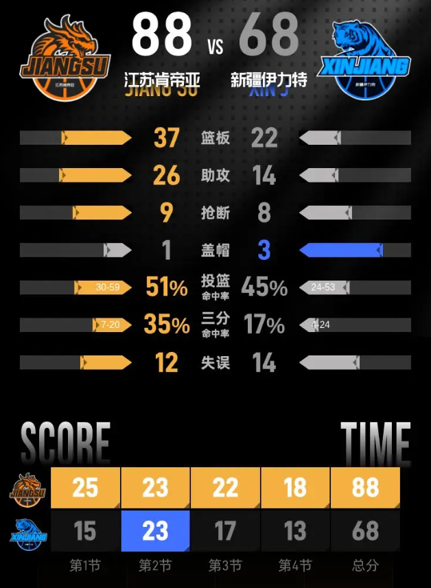 进入最后一节,江苏肯帝亚再次面临挑战,开局手感依旧没有回暖,导致双方分差萎缩至12分。在关键时刻,江苏肯帝亚重新找回状态,迅速打出一波进攻高潮,将优势扩大至23分。新疆伊力特虽奋力追赶,但未能扭转局势。最终,江苏肯帝亚以88-68成功赢得比赛,取得胜利。