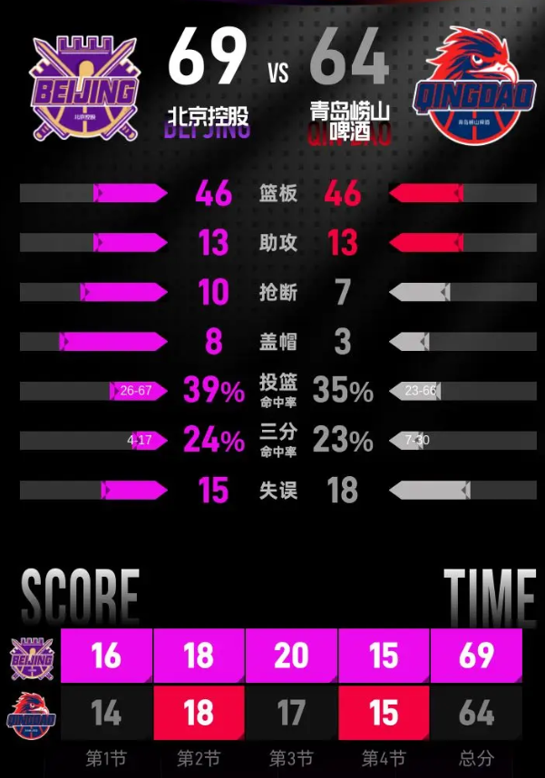 第四节,局面开始出现波动,北京控股开局状态不佳,青岛崂山啤酒状态回暖,迅速将比分抹平并一度领先5分。随着比赛进入关键时刻,北京控股稳住心态,逐渐缩小分差并反超。最终,北京控股以69-64战胜青岛崂山啤酒,赢得了比赛。