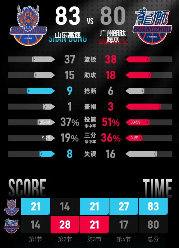 第四节,小节开始,山东高速逐渐进入状态,开始发力,将比分追平并反超5分。后段,广州朗肽海本止血,缩小分差。本节比赛山东高速的德沃恩·艾库恩-珀塞尔获得12分,其中包括2记三分。第四节最后时刻,高诗岩2罚1中给了广州队在常规时间扳平比分的机会,但邵炜昀最后的绝平三分未中,最终,山东高速以83-80赢下比赛。
