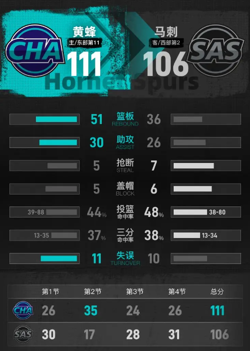 最后一节,黄蜂再次展现强劲火力,开局迅速将领先优势扩大至13分。马刺奋起直追,成功将分差缩小至2分。比赛进入白热化阶段,黄蜂保持进攻节奏,稳步拉开比分。最终,在比赛的最后时刻,黄蜂以111-106战胜了马刺,赢得了这场精彩的比赛。