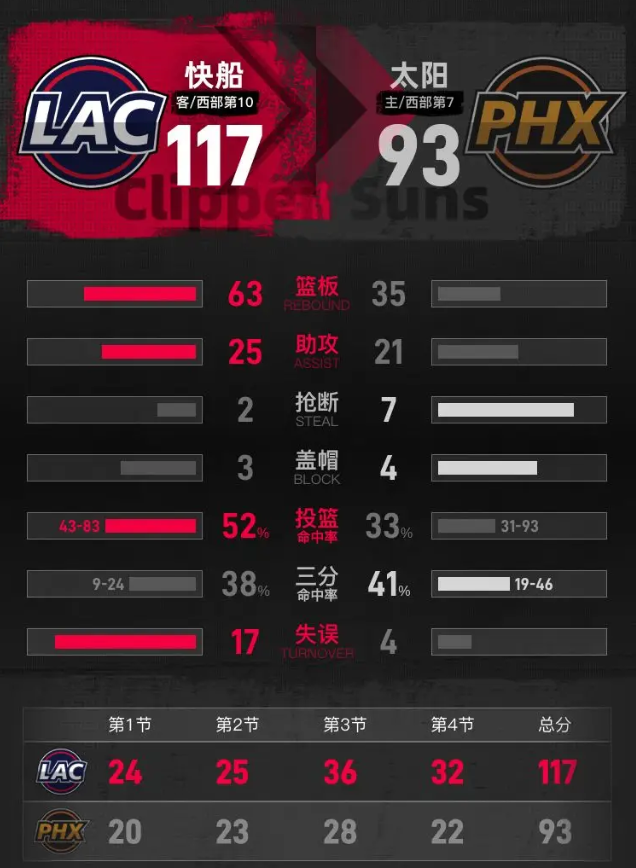 第四节,快船在小节开局阶段发起猛攻,迅速将分差扩大至24分。虽然太阳在段后期努力追分,但快船的米勒在这个节段获得了10分,包括两记三分。最终,快船以117-93赢得比赛。