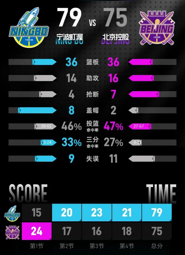 第一节,宁波町渥开局打出一波进攻以9-8领先,随后北京控股开始发力,不仅抹平比分,还领先宁波町渥15分,小节后段,宁波町渥逐步拉近分差。第一节,北京控股以24-15领先。