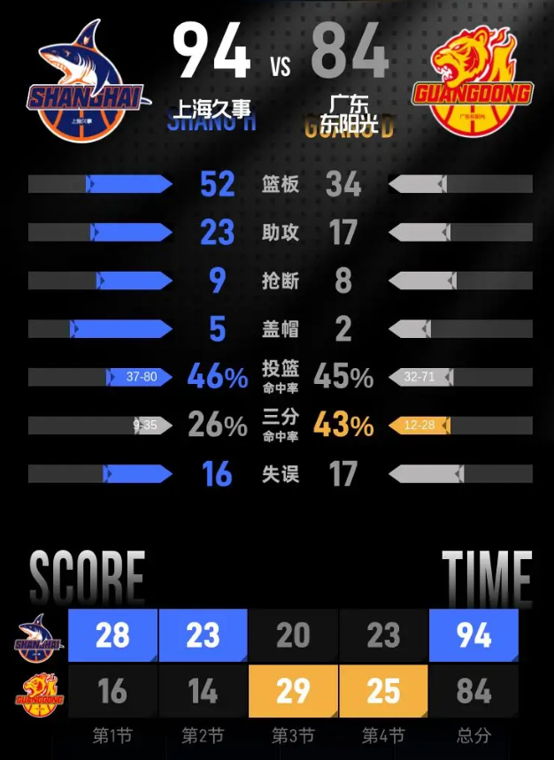 第四节,上海久事尽显统治力,始终牢牢掌控局面,广东东阳光无力反击。在这一节,上海久事的哈桑·怀特塞德贡献了12分,进一步巩固了胜局。最终,上海久事以94-84赢得了比赛。